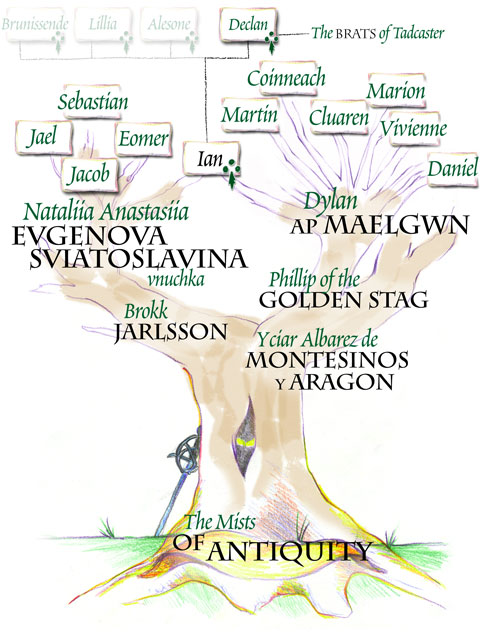 NOTE: As of 2015, I've had to update the list of my cadets up there: my only cadet left standing is Declan; Bruni put fencing aside for a while to pursue arts & sciences and became a Laurel; Lillia has been recognized for her service to Heraldry and made a Pelican; Alesone has gone off to pursue other teachings. I think Nataliia has picked up a few more cadets in six years, too, which means more relations on that branch.